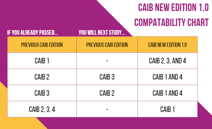 - No need to retake completed exams. Any CAIB exams you’ve already passed remain valid, and all editions are fully compatible with earning your designation.